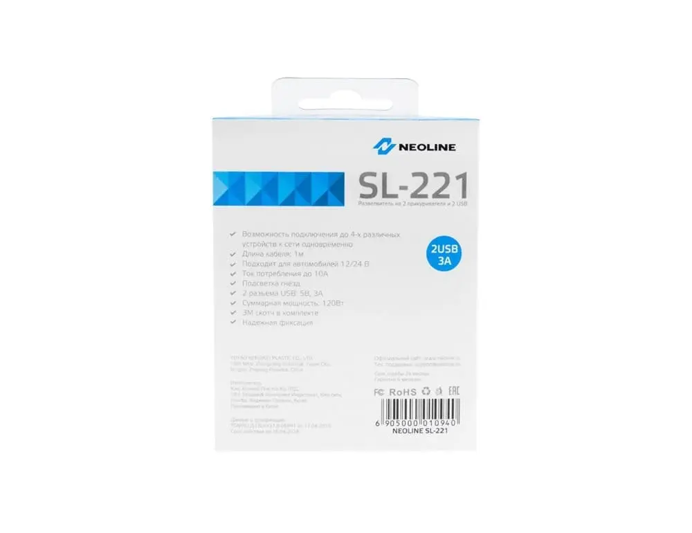 Два USB порта силой тока 3А и два разъема прикуривателя мощностью 120 Ватт позволяют подключить до 4х устройств одновременно. В комплекте идёт планка для фиксации либо на 3м скотч. Данное решение очень удобно для постоянного использования разветвителя, когда не возникает необходимости регулярно его перемещать. Система крепления в разъёме прикуривателя очень надёжная. Пригоден для использования как в легковых, так и в грузовых автомобилях, в которых исходящее/входящее напряжение различно – 12В и 24В соответственно. Neoline SL-221 имеет специальное покрытие Металлик, которое защищает от царапин.