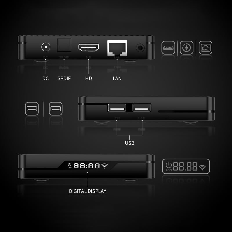 В комплекте — Bluetooth пульт с микрофоном для голосового управления. Поддерживается технология HDMI CEC, позволяющая управлять телевизором и приставкой одним пультом. На передней панели расположен цифровой дисплей с часами.